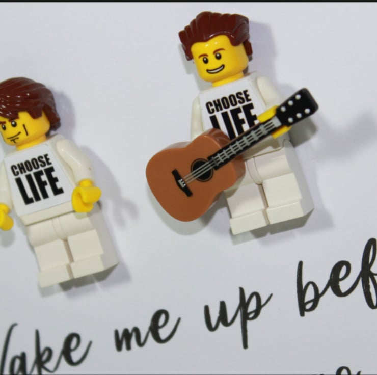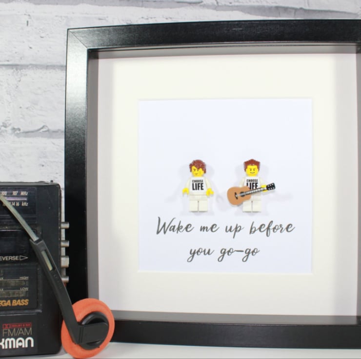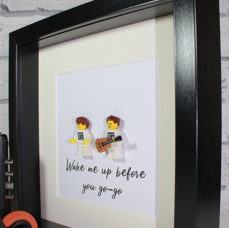 It is the music world that brings us to our latest creation... Ladies and gentlemen please give a warm welcome to our tribute to one of the greatest pop bands of the 1980s... We give you Wham! We have custom made these little chaps using original Lego parts, giving them their trademark Choose Life tops and mounted them in to a deep box frame. We complete the frame with the classic lyrics "'Wake me up before you go-go."
