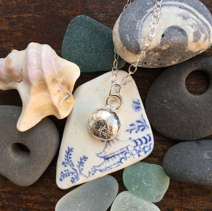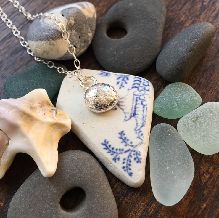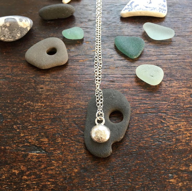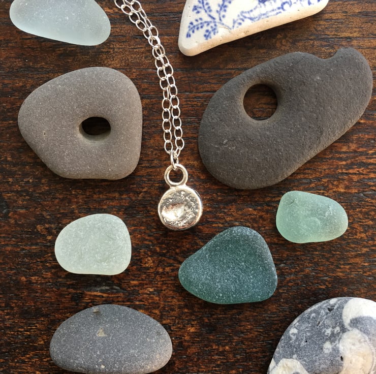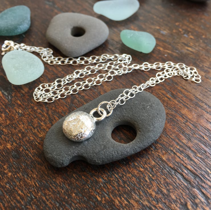 A simple, stylish pendant formed from recycled sterling silver which has been heated to create a solid nugget with a lovely molten texture. A ring has been soldered on to the top for it to hang.