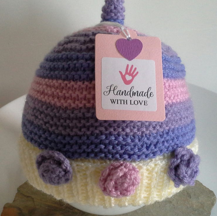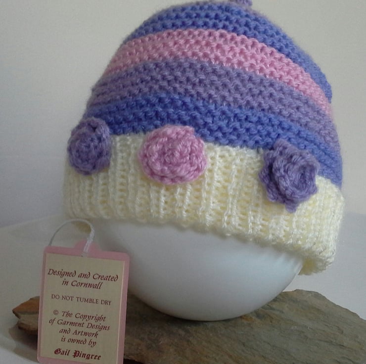 An adorable unique baby girl's Beinie hat designed and totally hand crafted using quality branded machine washable British manufactured yarns. Attached to the hat's ribbed band are three hand knitted rose buds firmly attached for baby's total safety.