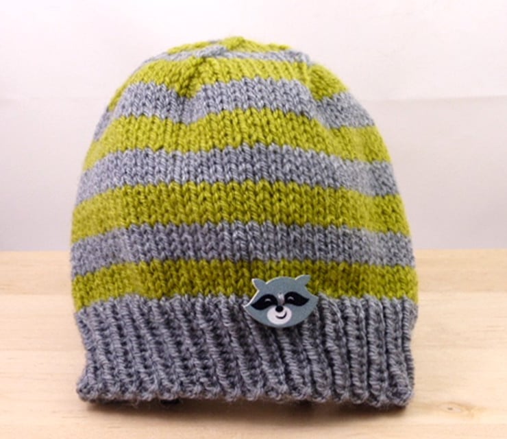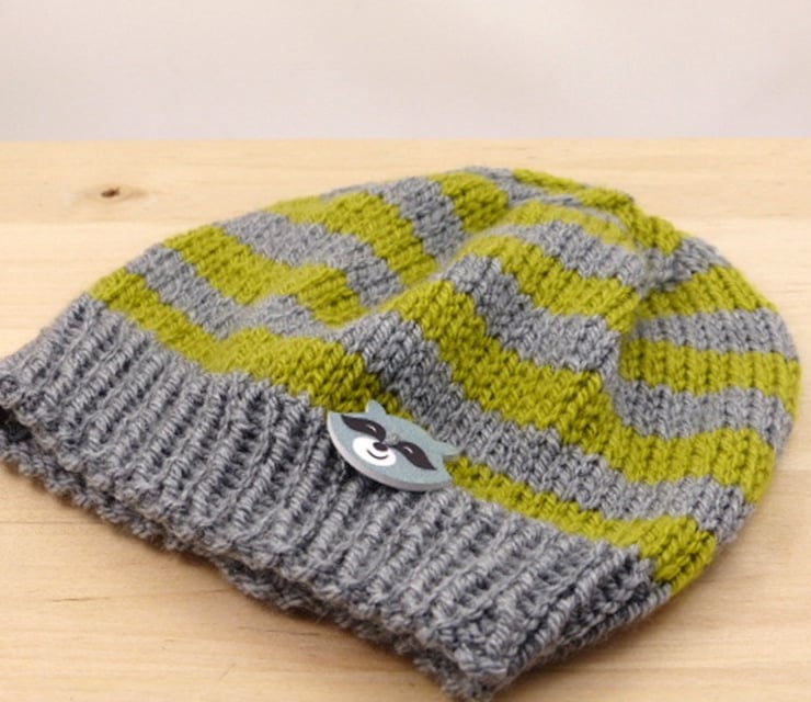 A hand knitted stripey beanie hat in charcoal grey and pistachio green 100% acrylic yarns. It measures approximately 14" in diameter by 6.5" in depth and is trimmed with a cute wooden Racoon button. An ideal gift for a newborn baby.