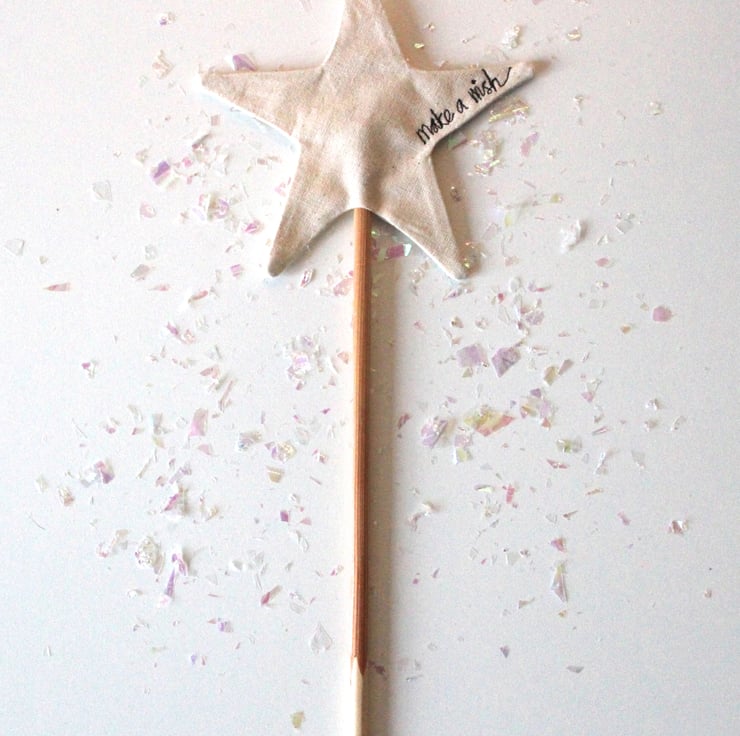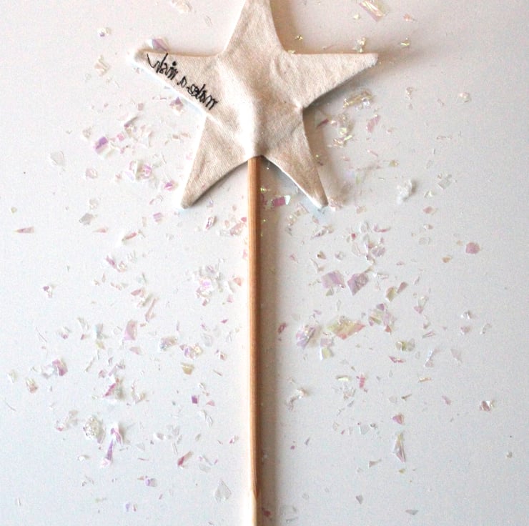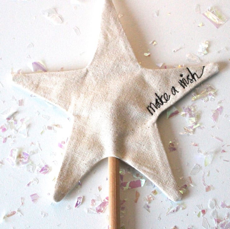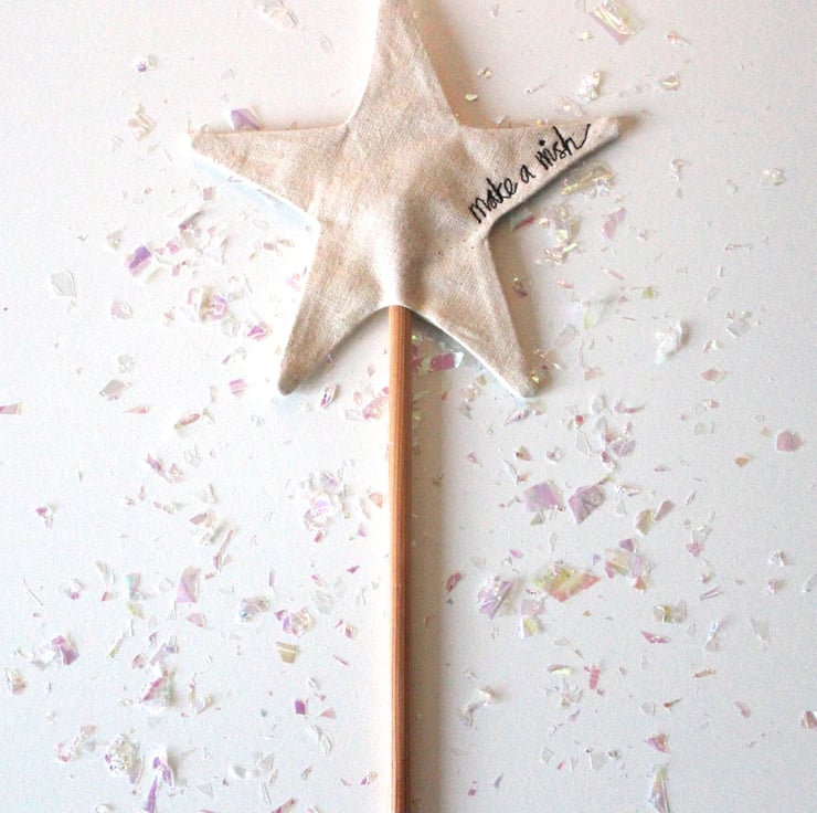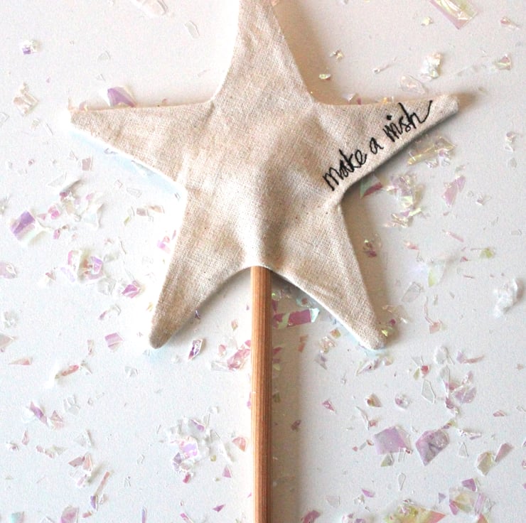 Magic wand is created using free hand machine embroidery and cotton cloth. The star is sewn and then turned inside out so that the stitches disappear and each point of the star is softer in appearance. The dowel has been sanded smooth, to be kind to little hands.