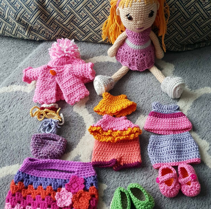 My inspiration was a fantastic pattern by Kristi Tullus: https://www.ravelry.com/patterns/library/doll-in-a-dress. I then designed some extra clothes and shoes to go with her!