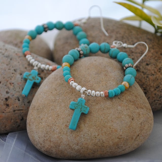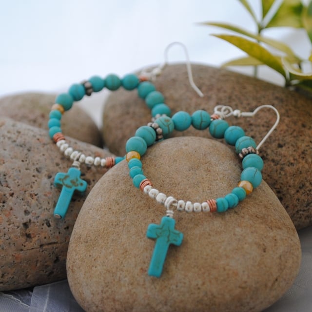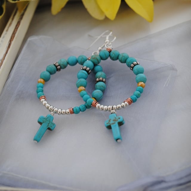 Hoop earrings made with a howlite turquoise cross, turquoise howlite beads with silver seed beads, copper wire swirls and complemented by small yellow rondelle crystal beads.