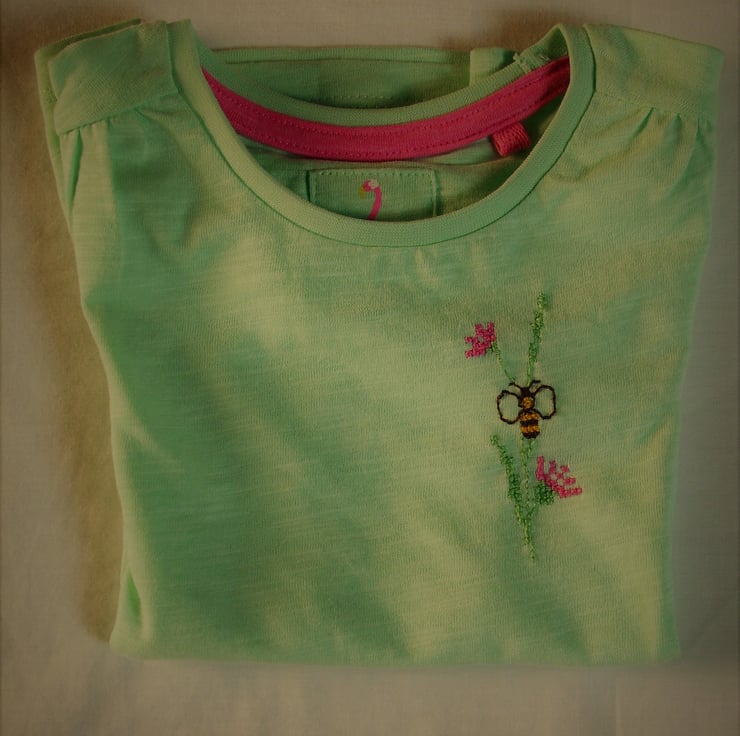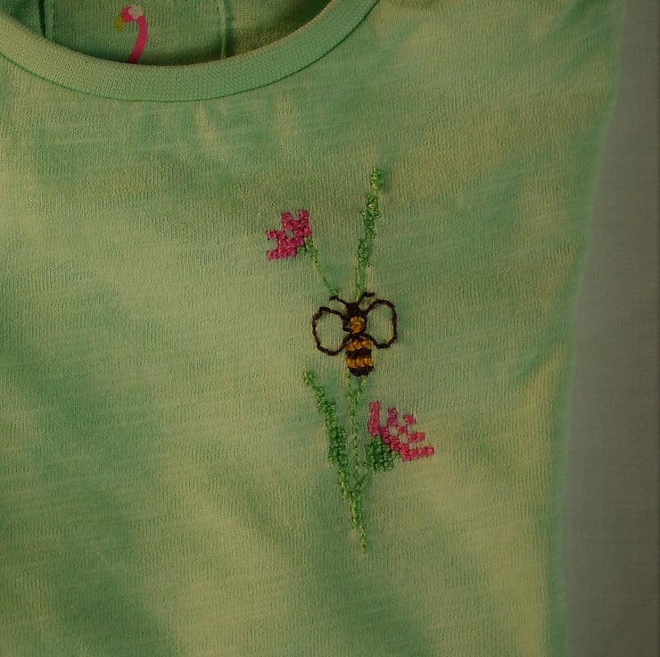 This is a very pretty pale green T-shirt with slightly ruched shoulders. I have hand stitched a bee visiting pink flowers on it. The shirt is 100% cotton and can be machine washed.