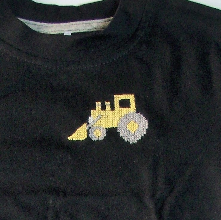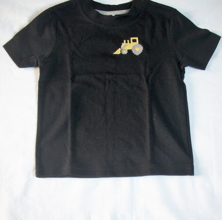 I have hand stitched a yellow digger on this smart black short-sleeved T-shirt .I never use a backing material when embroidering kids' clothing, so there is nothing inside the shirt to irritate your child's skin. It is 100% cotton and machine washable.