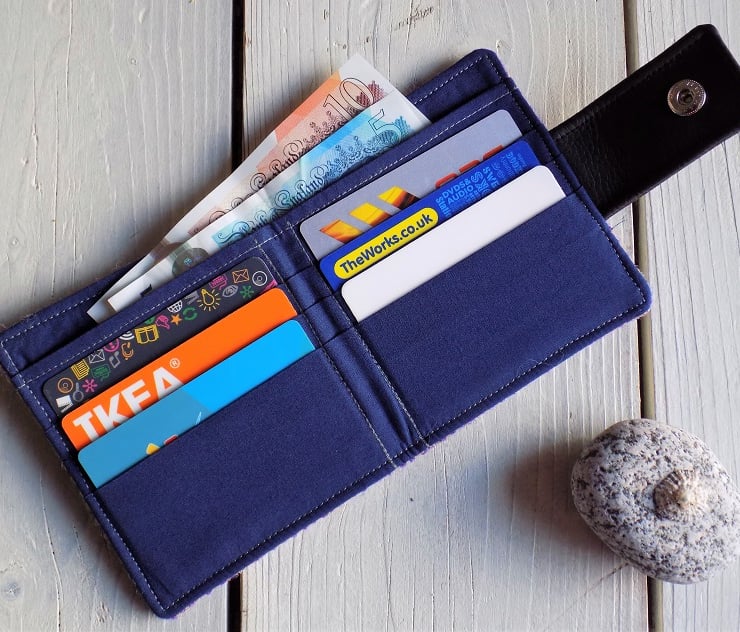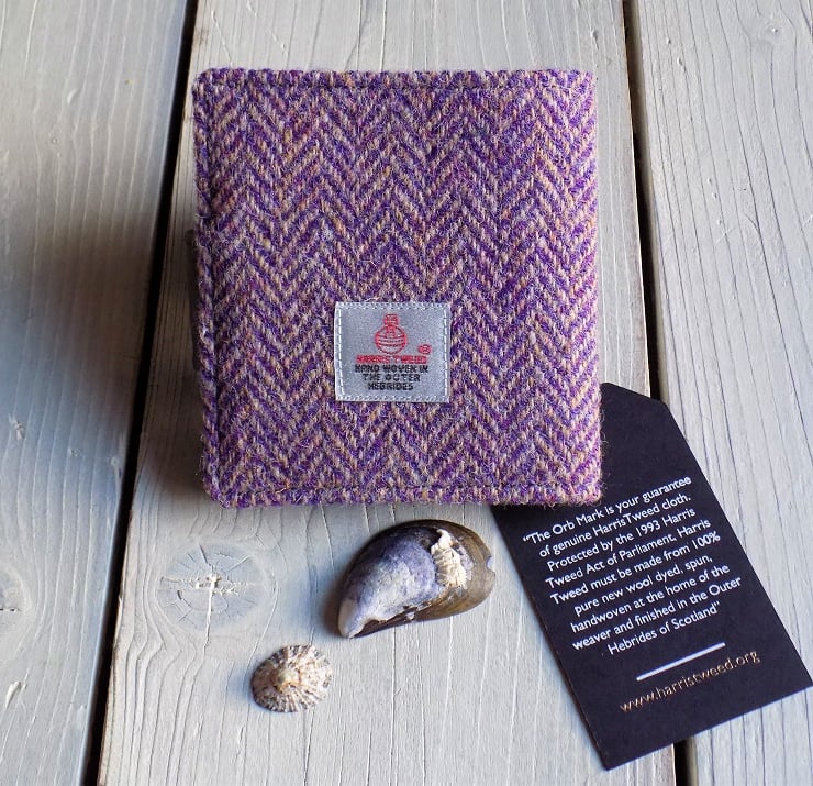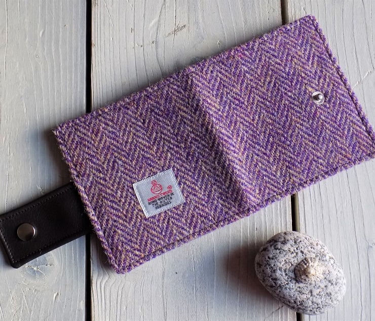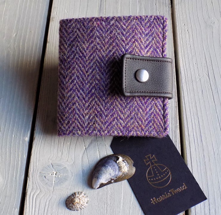 Harris Tweed bifold wallet in purple and beige herringbone weave, with a navy blue cotton lining. There are 6 card slots inside the wallet, and a top slip pocket for notes. It is secured with a brown recycled leather tab with metal snap.