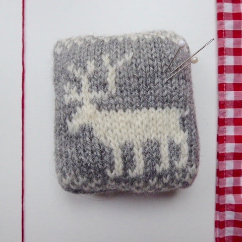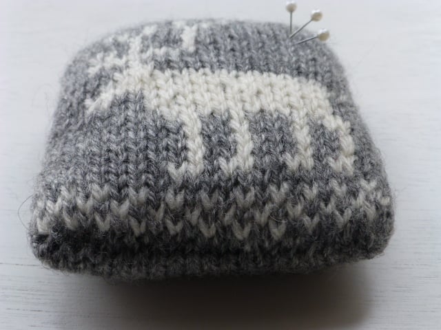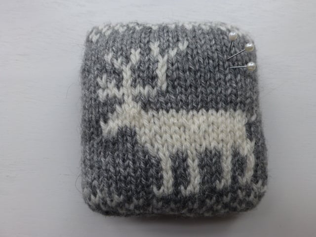 A reindeer standing in a snowy field. Nothing says Christmas more that this classic Nordic design. It has been used to make a contemporary pincushion and is part of a collection from my book '50 Pincushion to Knit and Crochet'.