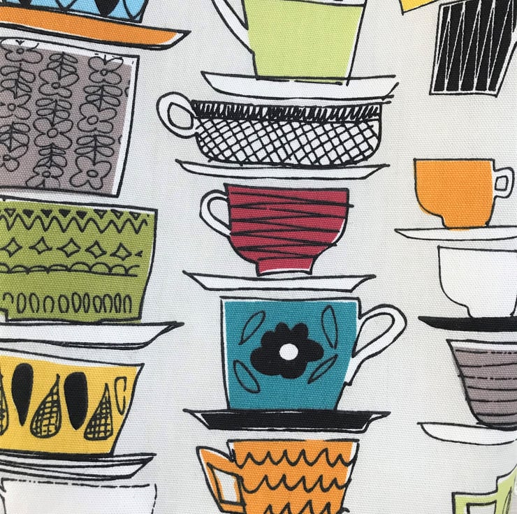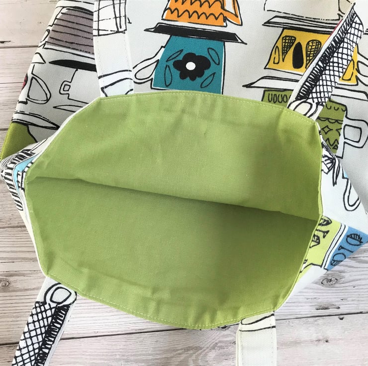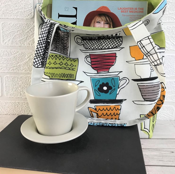 A useful tote bag in an attractive print fabric featuring a pattern of drawings of cups and saucers on a cream backround. The cups and saucers are in lovely bright shades of blue, green, yellow, orange, red and white, and they are outlined in black and feature black patterns. The bag is lined with a zesty lime green fabric which complements the green accents in the outer fabric.
