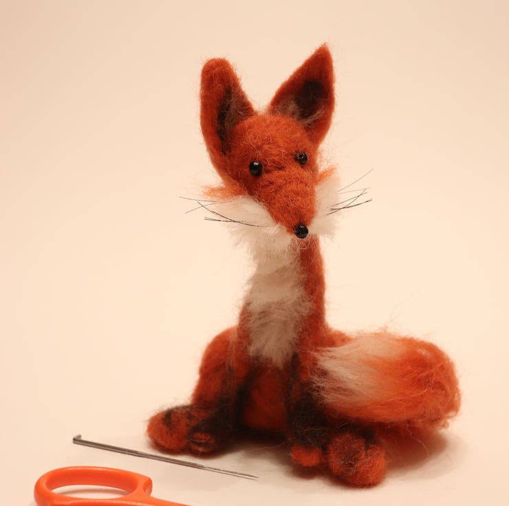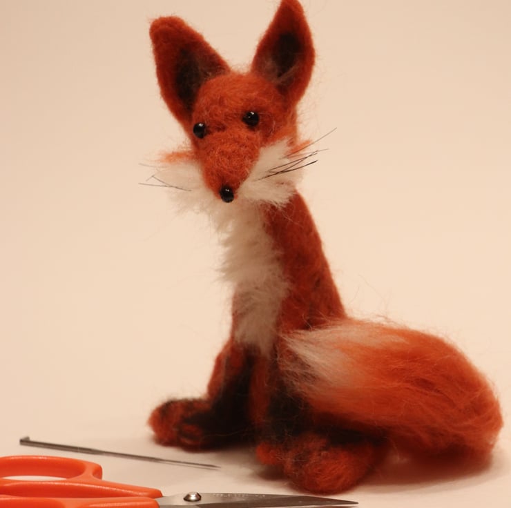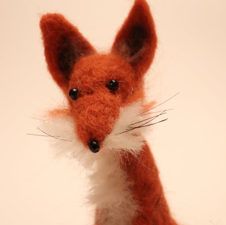He is needle-felted from dyed cinnamon Shetland wool, with white and black Shetland features. He has glass bead eyes and nose, and horsehair whiskers.