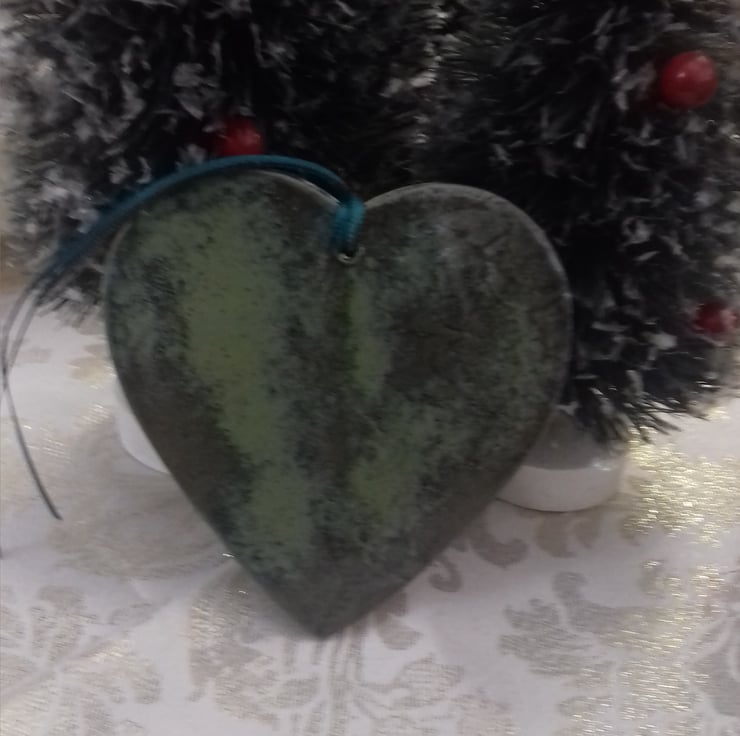 Handmade ceramic green heart hanging decoration, glazed using shiney green glaze. Ribbon for hanging . Size approx 7cm by 7cm.