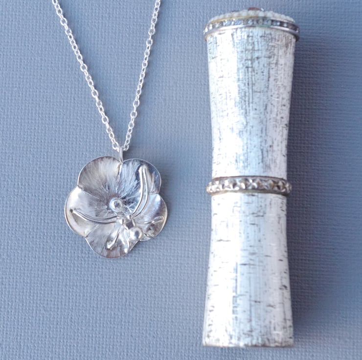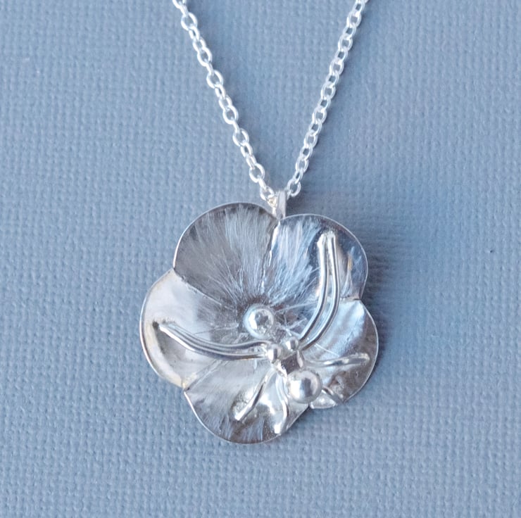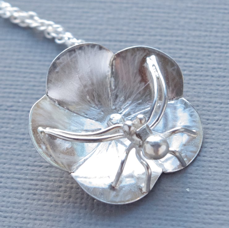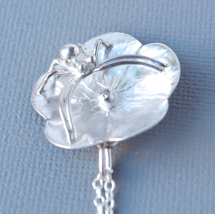 This is the second spider pendant I have made as a pair with the classic garden spider pendant shown elsewhere in my shop. This particular spider is a species called a crab spider which uses a flower to hunt pollenating insects, such as the blue cranesbill shown here, rather than spinning a web. I have made the abdomen flatter and the front legs much longer than the back legs to accurately recreate the pose this spider usually holds. I am particularly drawn by the irony that the delicately beautiful flower which is designed to attract insects to it, and which is a resource they need to live, becomes literally a honey trap for the unwary. The flower has been hand carved, domed, given a satin petal like finish and hand engraved by me to show the petal edges and the creases in the petal as it narrows towards the centre of the bloom. The spider itself features wire work and granulation with highly polished sterling and fine silver details. This striking and extremely unusual piece of miniature sculpture would make a fantastic gift for anyone who loves nature or gardening and measures 27 mm across, suspended from a 450 mm sterling silver chain. The final picture shows it next to a 3" or 80 mm vintage lipstick case to give a sense of scale. This pendant has been hallmarked by the London Assay Office for 925 sterling silver and has a 2019 date letter.