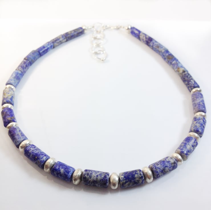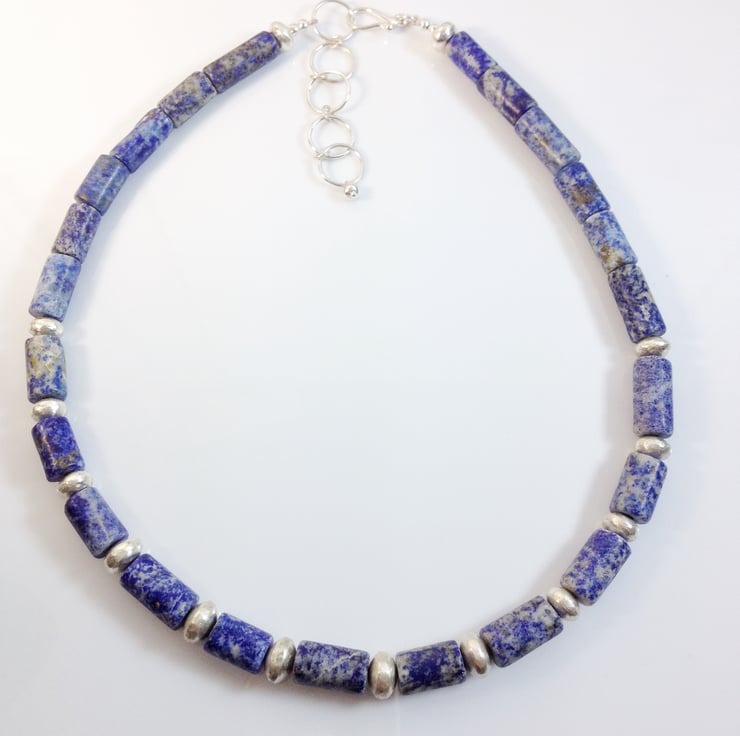 A chunky classic statement necklace made from lapis drum beads and silver rondelles.