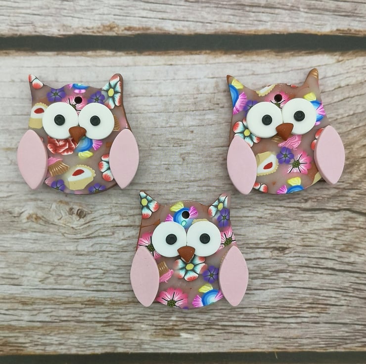 3 cute polymer clay owls pendants. Decorated with slices of millefiori with cake, flower and other patterns and on a terracotta coloured back. Owls have little pink wings.