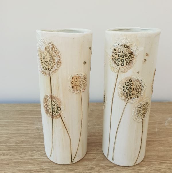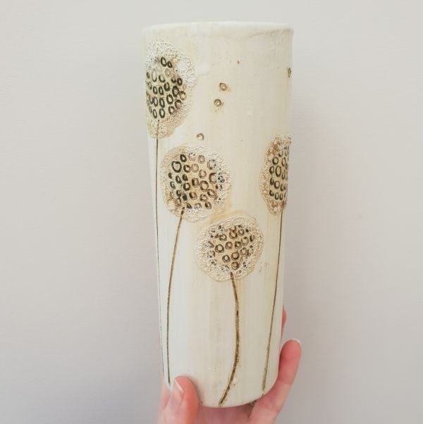 Handmade in my studio, this gorgeous cylinder shaped ceramic vase has been slip cast from one of my own handmade plaster moulds. The vase is approx 20cm tall, and includes my signature Dandelions design.