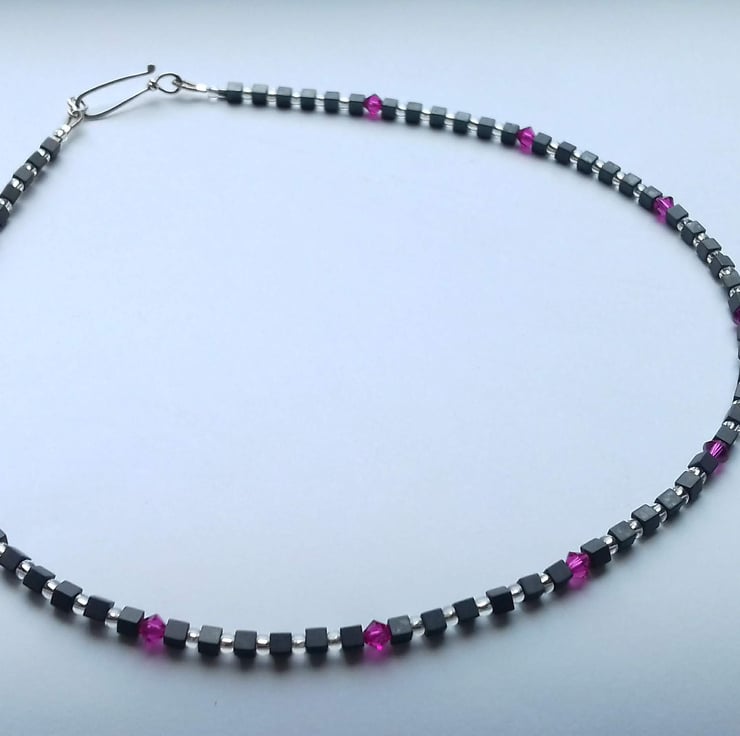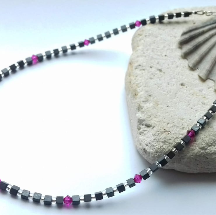 Hematite cube beads, silver lined glass beads.