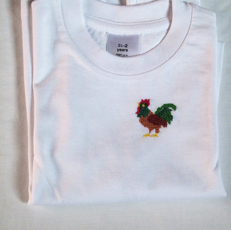 I have hand stitched a colourful cockerel on a plain white cotton T-shirt with short sleeves and a round neck. As I never use a permanent backing material when hand embroidering kids' clothing, there is nothing inside to irritate your child's skin. The motif is colour-fast and the shirt can be machine washed.