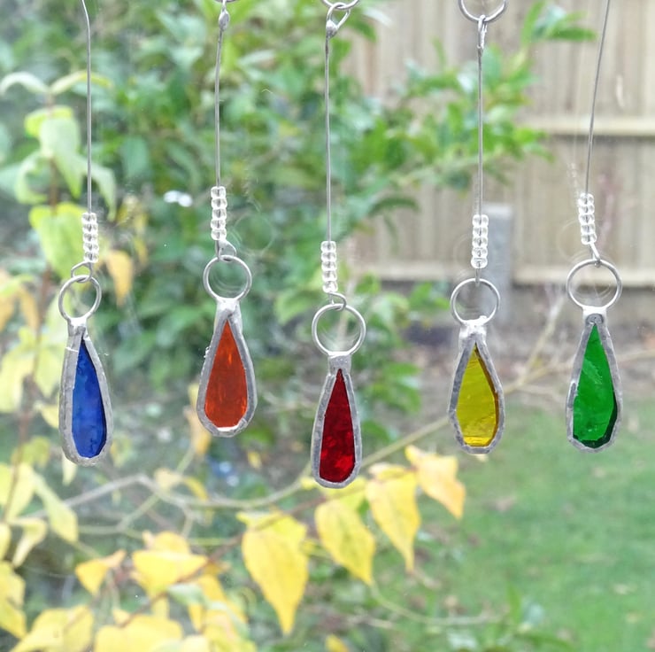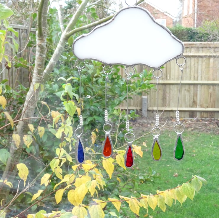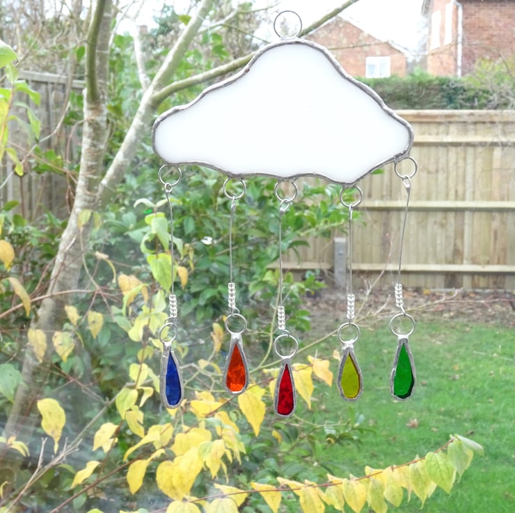 The rain cloud has been made from white opaque glass and the hanging raindrops from vibrant stained glass. Each raindrop is suspended on a length of beaded wire. A ring and and length of fishing line is attached for hanging purposes and would be great if it can but hung somewhere that it can move freely.