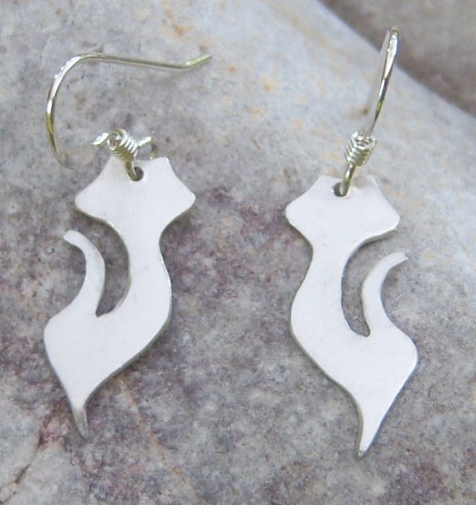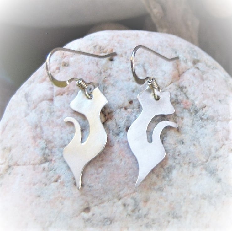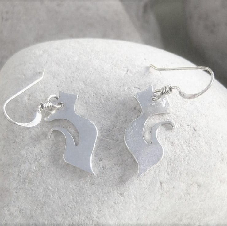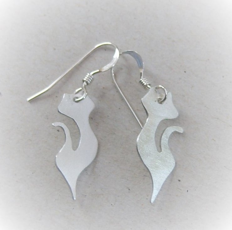 Silhouettes of a cat cut from a sheet of sterling silver. Approximately 2 cms tall. Finished with sterling silver ear wires
