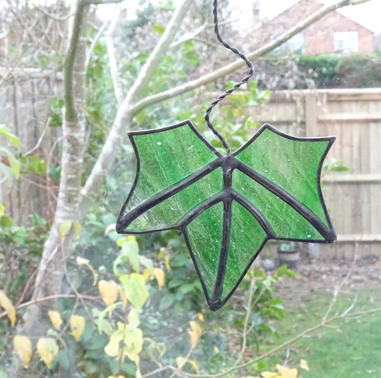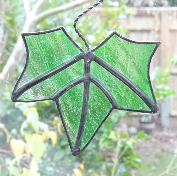 This leaf has been made from green streaky glass. Each piece of glass has been foiled and soldered and a patina applied to blacken the solder. The stalk has been made from twisted wire forming a loop to hang from.