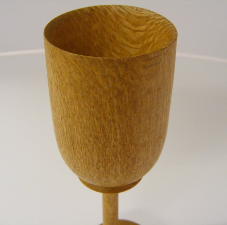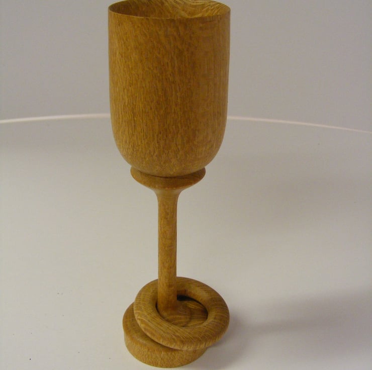 The shape of this goblet much like a wine glass with a groove V detail at the base of the cup and a slight step in the base really shows off the checked/flecked nature of the Silver oak, it also has a captive ring.