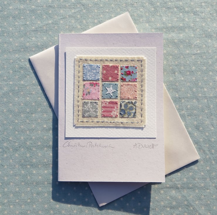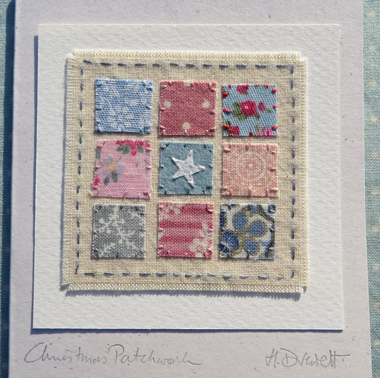 This is a small hand-made greeting card featuring a miniature hand-stitched applique 'patchwork' with white star in the centre. Made using pretty cotton prints with intricately embroidered stitching. It is entitled 'Christmas Patchwork' a special little card to keep!