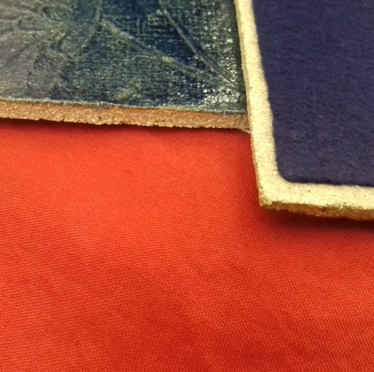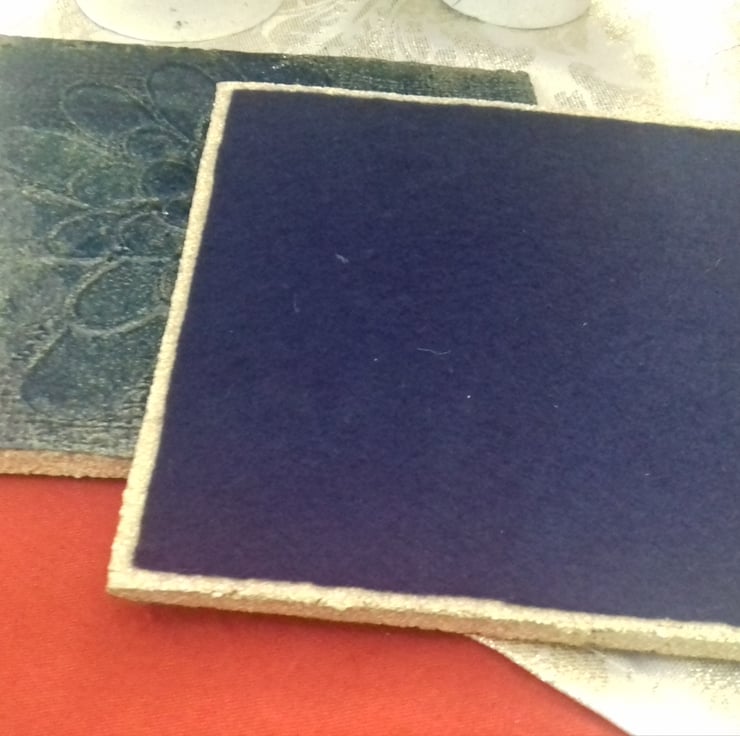 Handmade ceramic blue embossed tile coaster x 2. Tile has embossed flower pattern on the surface & finished only on the front side in blue glaze. Blue felt on the back of tile. clay is grogged & gives texture to the surface.