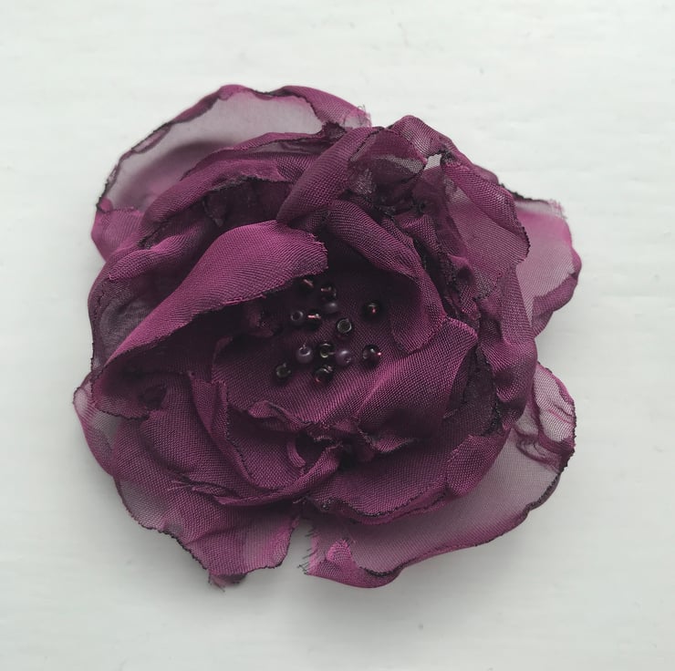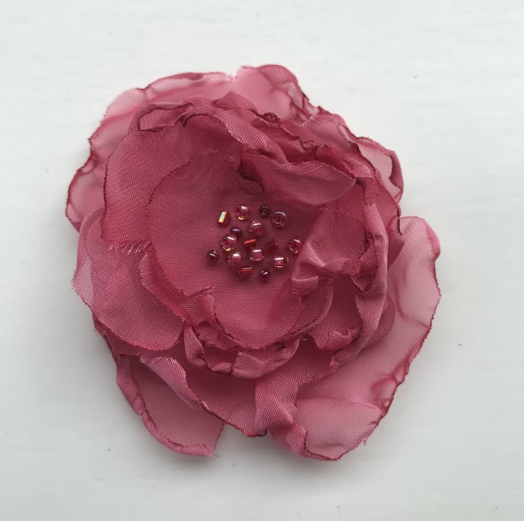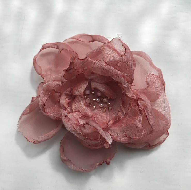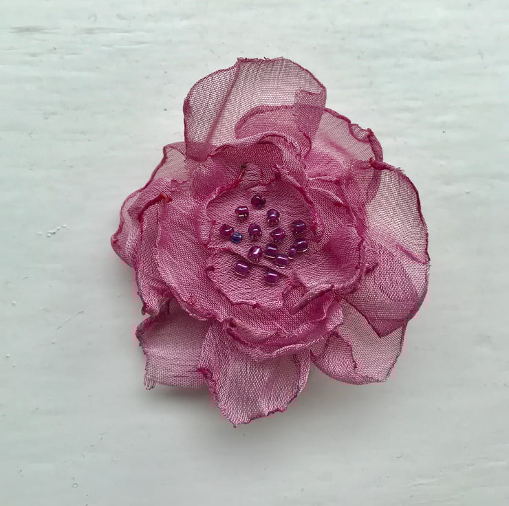 Made from several layers of different sized circles of chiffon. The centres are hand beaded, reflecting the colours of the petals and adding sparkle. There is a pin brooch fixing to the back.