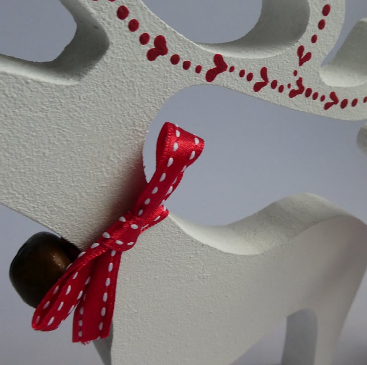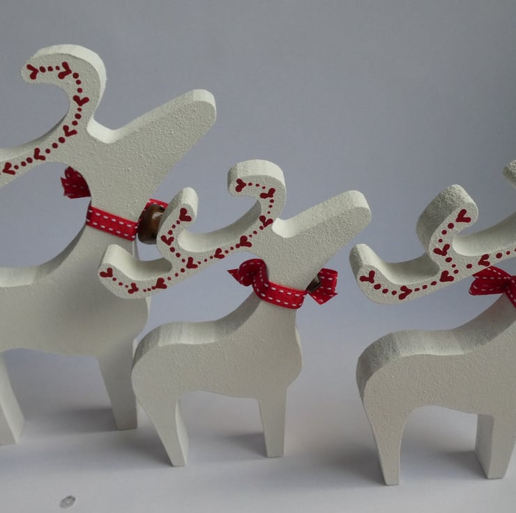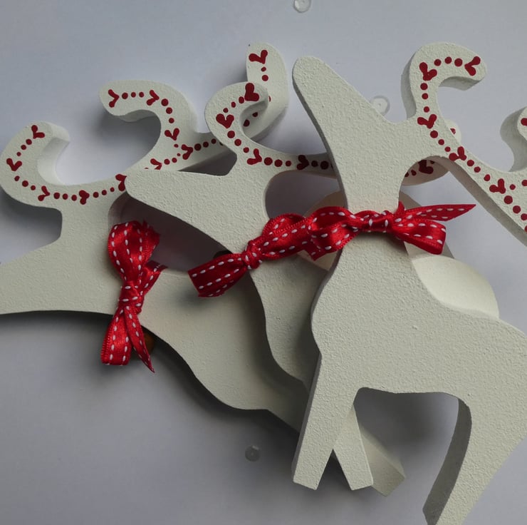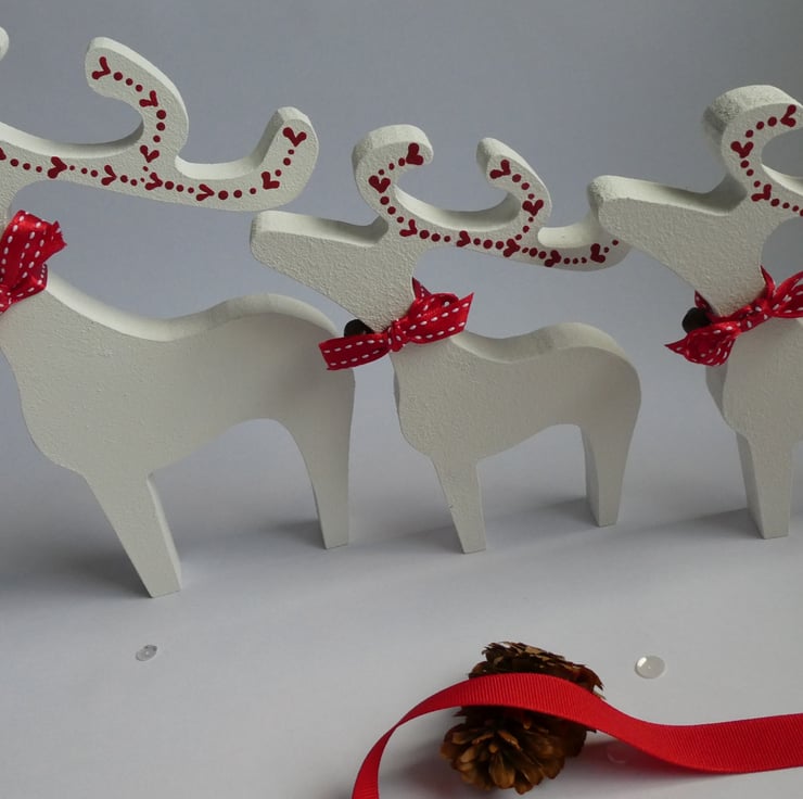 Set of 3 freestanding reindeer, handpainted in a soft white chalk paint with a lightly textured finish. They each have a red heart and dot decoration & a red ribbon tied in a bow with a rusty bell to finish.