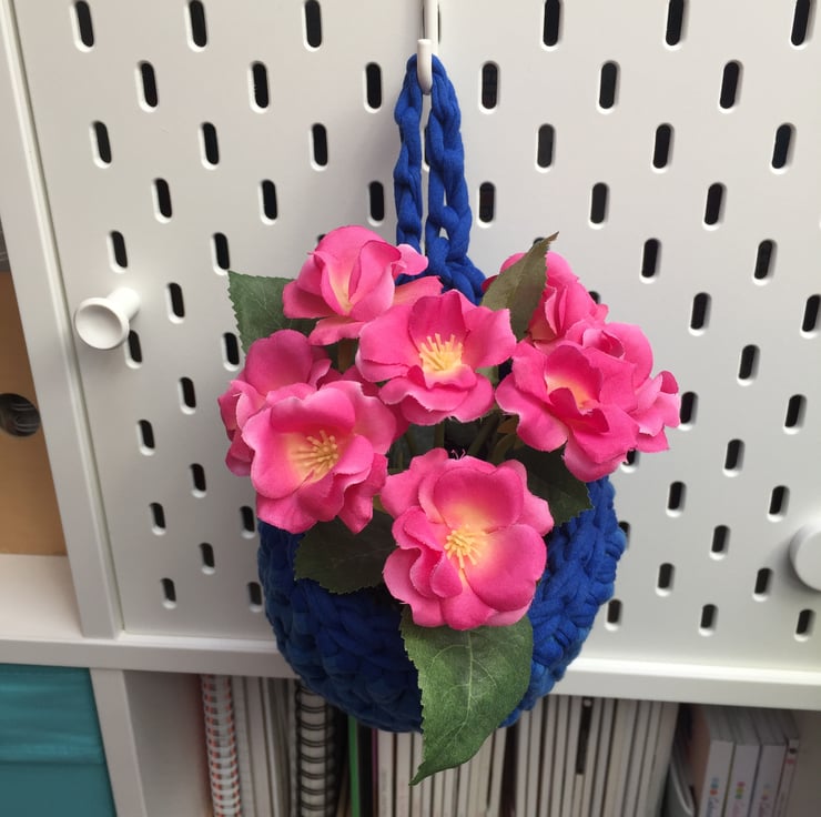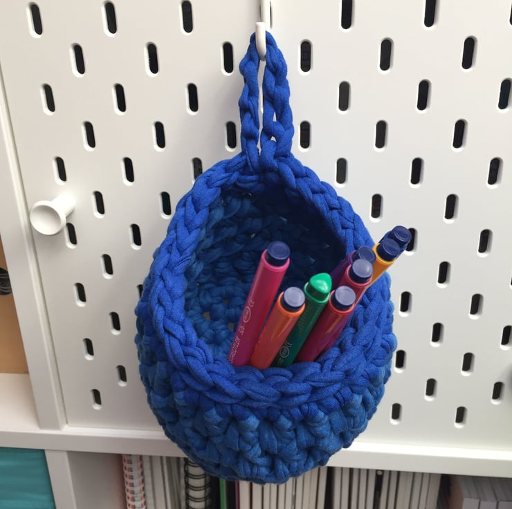 A small crochet hanging basket, perfect to hang on your pegboard, door handle or hook to store pens, craft items or keys. You could even pop in a small plant or jam jar of fresh flowers to brighten up your room!