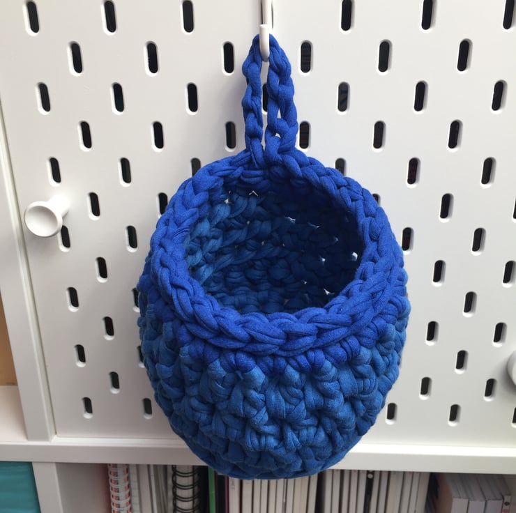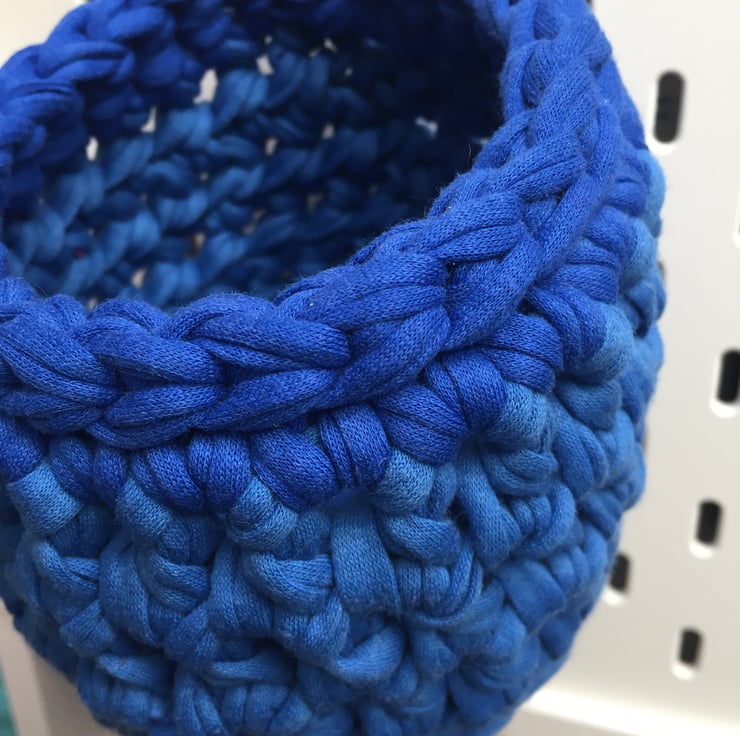 The yarns used for this basket are cobalt blue with a slightly lighter blue. I can make these in any colour - message me for details!