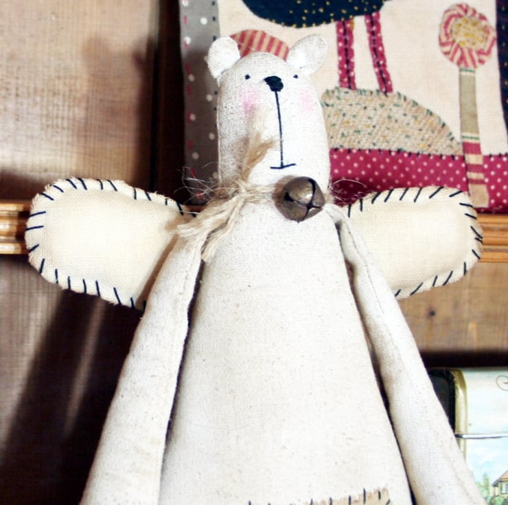 He is made from painted Osnaburg fabric which i have sanded so he is quite soft and smooth and then he has had a bit of a dip in coffee just to give him a vintage ,fresh out of the attic look.