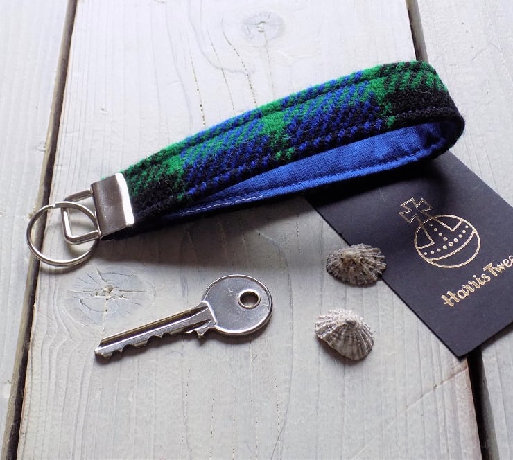 Harris Tweed key fob wrist strap: vibrant modern Mackay tartan weave in cobalt blue, emerald green and black, with cobalt blue cotton lining. The strap has a sturdy metal bar with keyring attached to keep your keys secure and easy to find in your pocket or bag. The woollen tweed fabric is hard wearing and dirt-resistant and can be spot-cleaned.