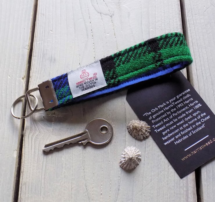 The back of the key fob carries the iconic Harris Tweed label which authenticates the fabric as pure new wool, hand woven in the Outer Hebrides of Scotland.