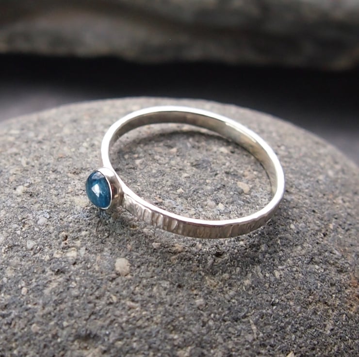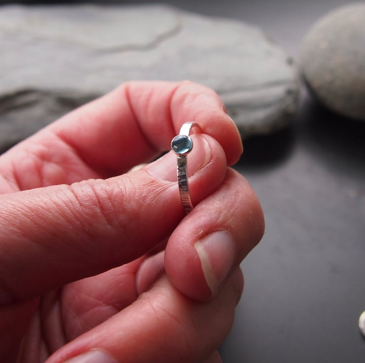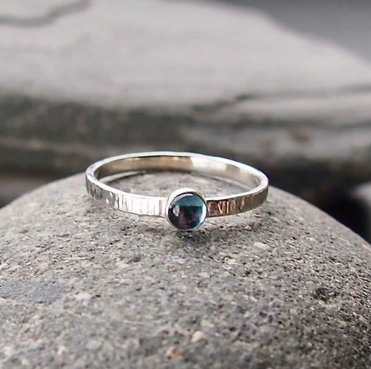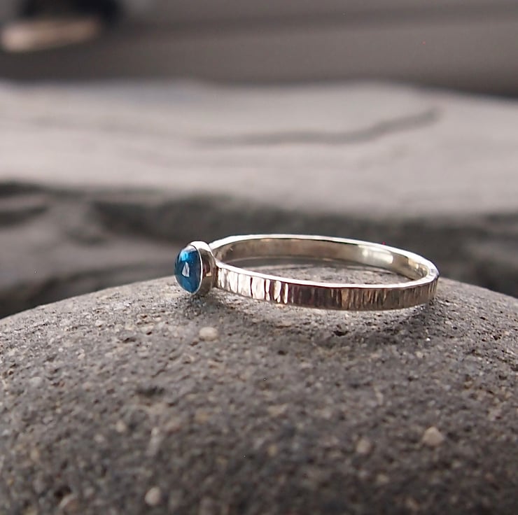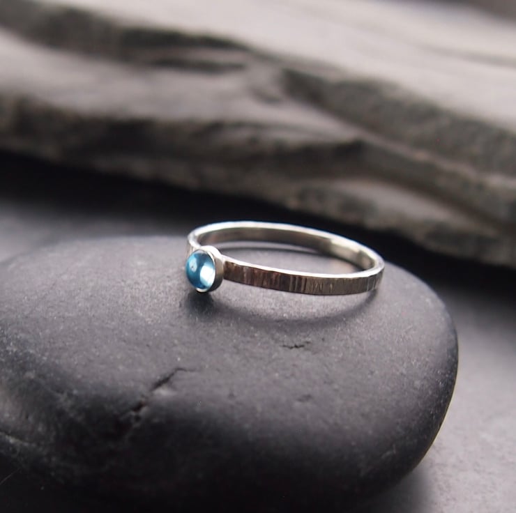 A slim 2mm textured sterling silver band with a 4mm bright blue topaz.