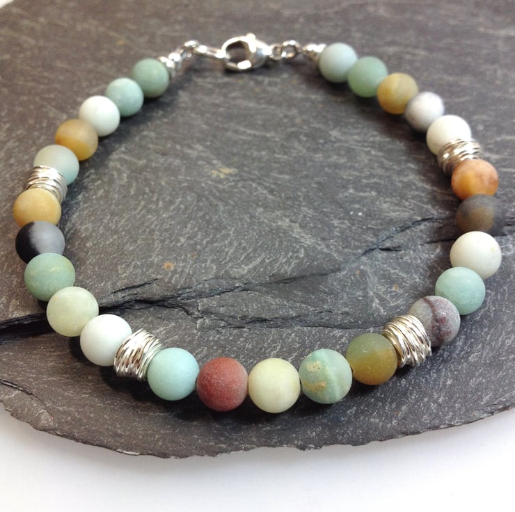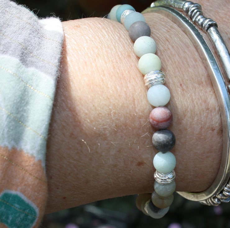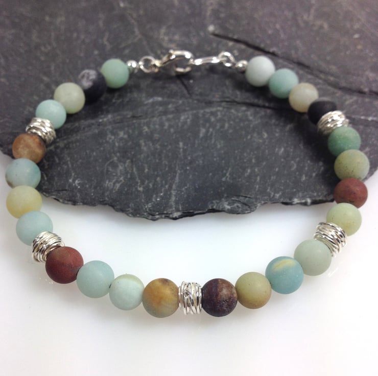 Frosted amazonite beads have been combined with bright polished silver nest beads to make this bracelet,