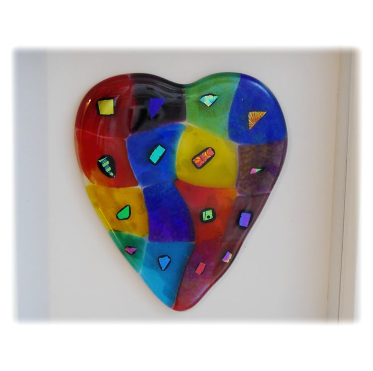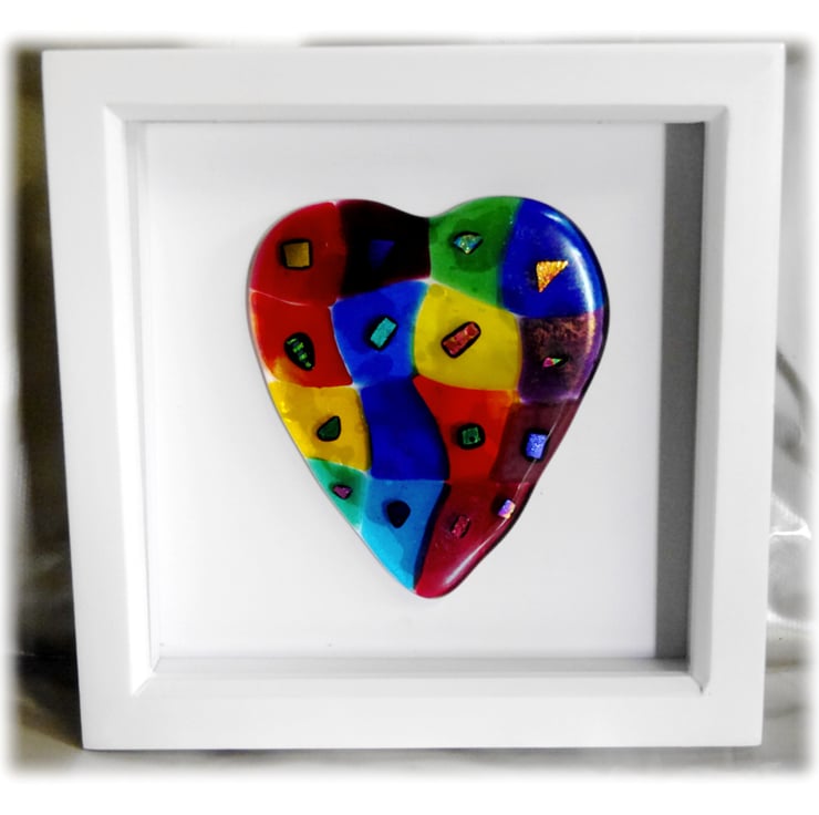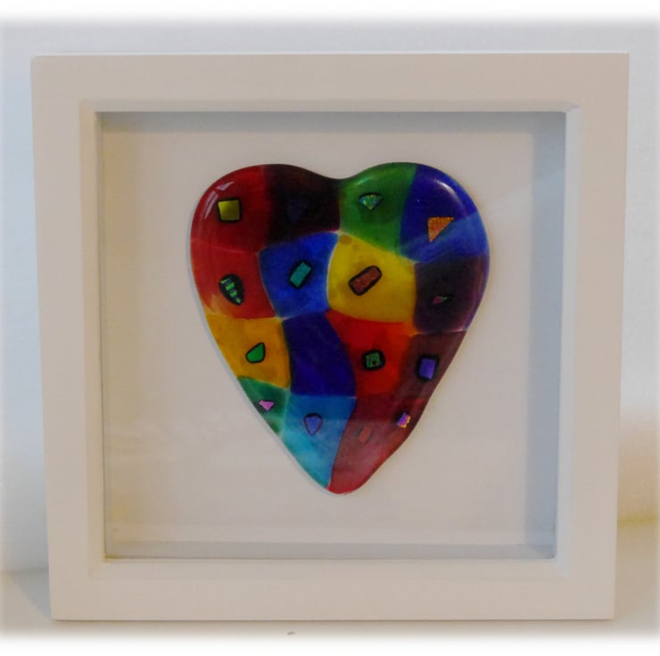 The fused heart measures 13cm x 10cm and is fitted at the back of a box frame with a 13.5 aperture, 18cm square frame, 3.5cm deep.