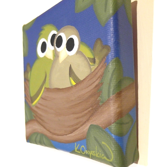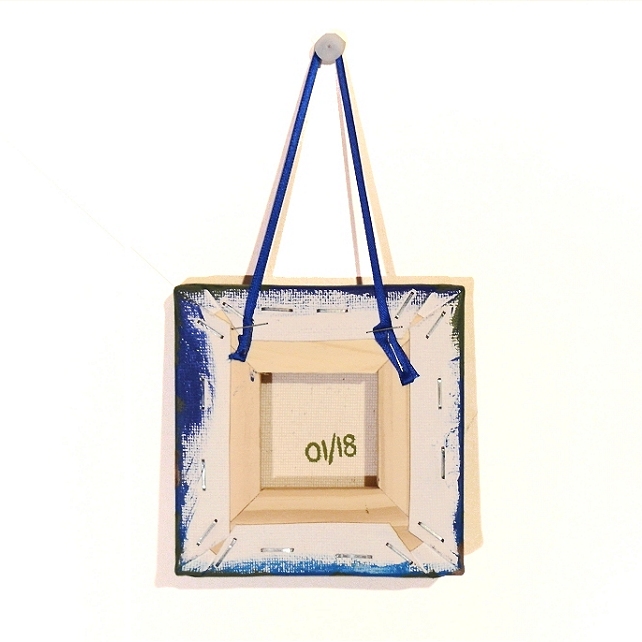 This original greenfinch art is painted in acrylics on a 10cm x 10cm small canvas (4" x 4"). The canvas has a blue ribbon attached to make it easy to hang, and will be posted signed for.