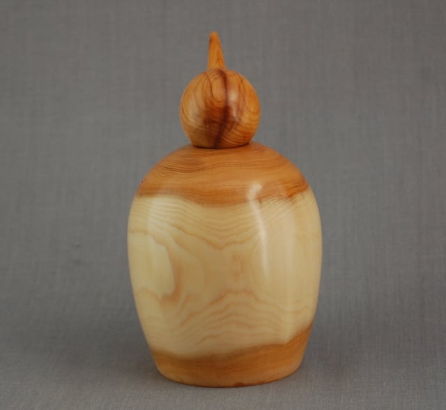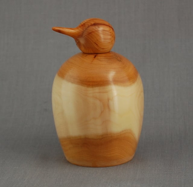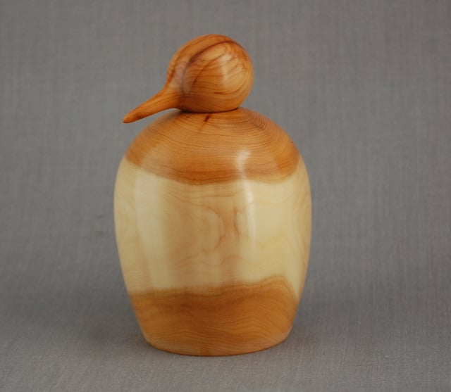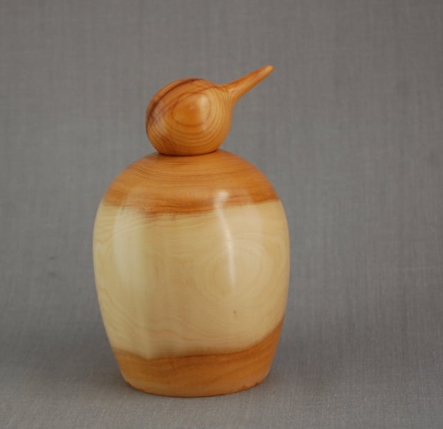 This chap turned out to be quite stately in his demeanour, quite possibly the head of the family. He is certainly well fed. All our penguins have adjustable heads-pensive, happy, star gazing, pondering on life-with a gentle adjustment two days need never be the same. . This penguin, turned from home-harvested yew, measures approximately 12 cm tall and 7 cm in diameter.