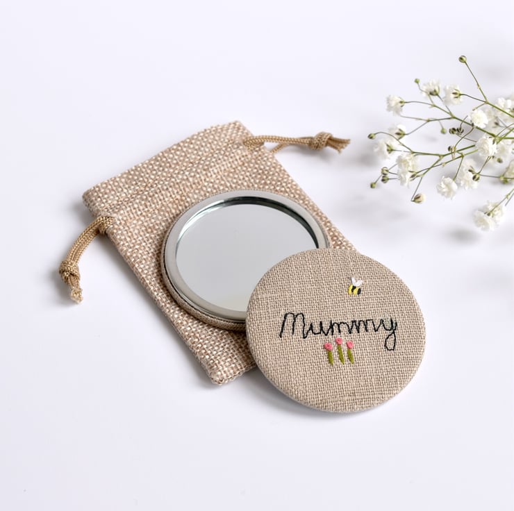 The mirror comes with a linen drawstring pouch making it a lovely little personalised gift, ideal as a Mother's Day gift or for a birthday.