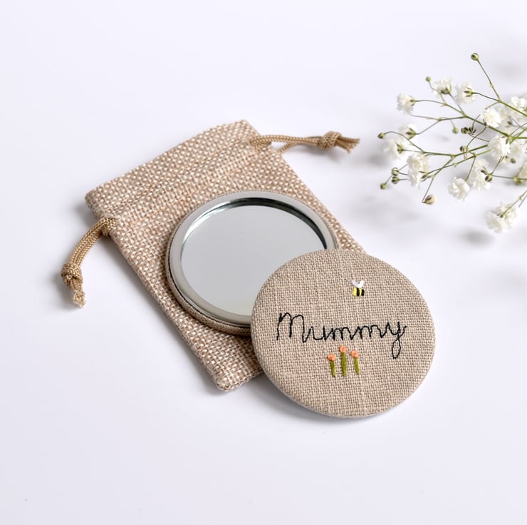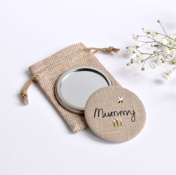 The mirror comes with a linen drawstring pouch making it a lovely little personalised gift, ideal as a Mother's Day gift or for a birthday.