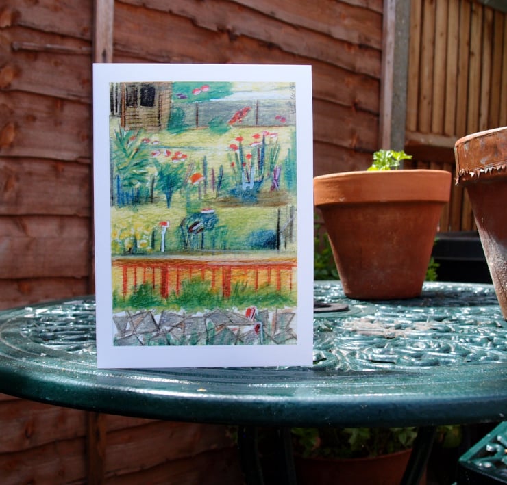 This card measures 5 x 7 inches and comes packed in a clear cello bag with a white envelope. It has been left blank for your own message.