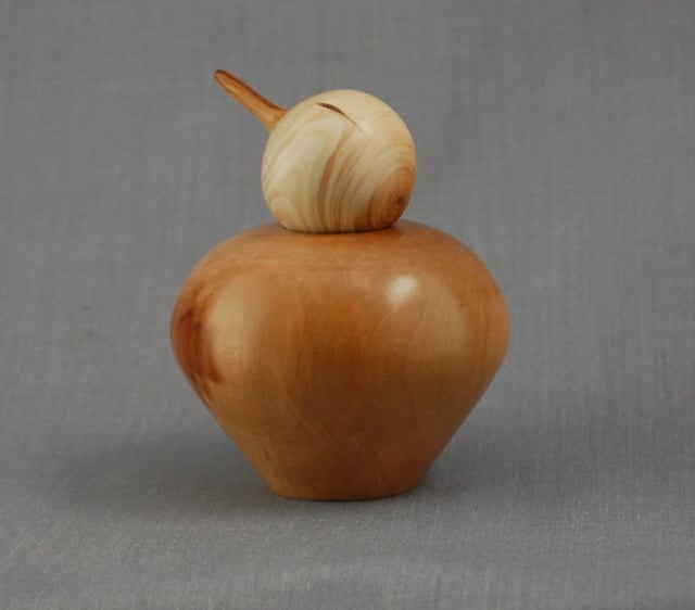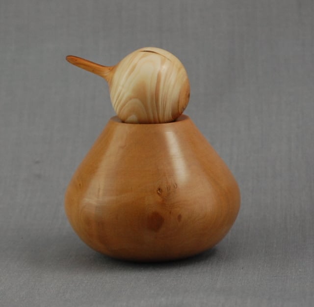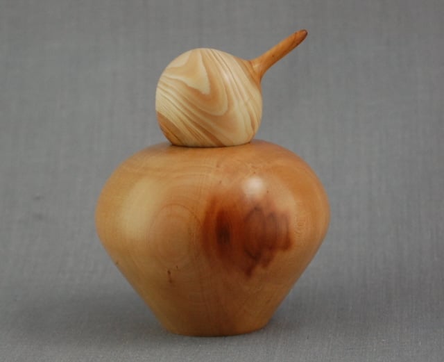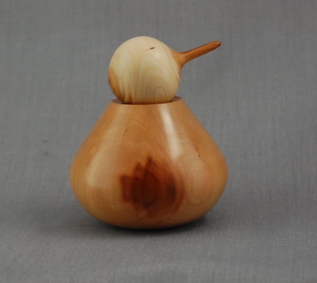 Small things are often the most attractive-and this cherry wood Tipsy-Topsy” bird of ours is certainly the smallest of the lot. When his large “shoulders” are uppermost, he appears to be puffed up with his own importance, but a bit dismayed when it all changes. Once turned over, the substantial “bulge” is a sign of overindulgence at the table! When you replace his movable head, you can signal his mood of the moment. He measures approximately 8 cm high and 7 cm in diameter.