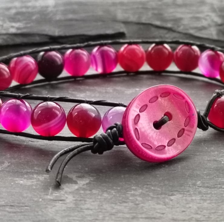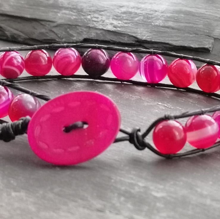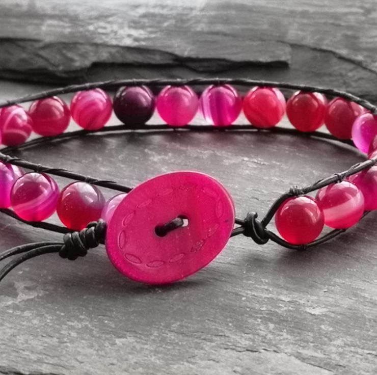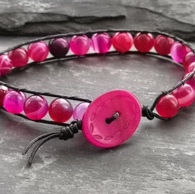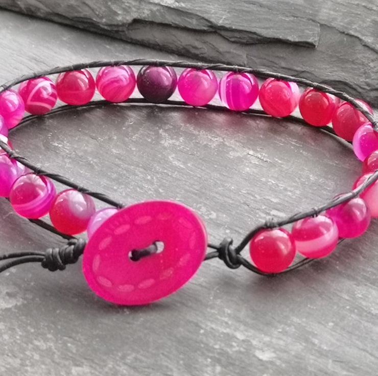 This colourful bracelet has been made with soft black leather cord. Vibrant pink striped agate beads have been attached and a shimmery pink button has been used as a fastener.