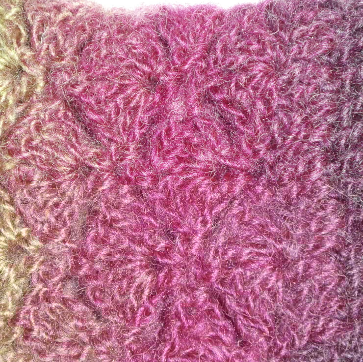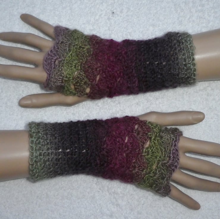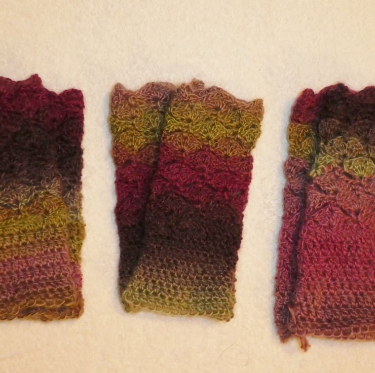 I have created these fabulous fingerless gloves from a long colour charge double knit weight acrylic yarn. I have used trebles for the cuff and a fan pattern for the body of the glove, with a thumb hole on one side .
