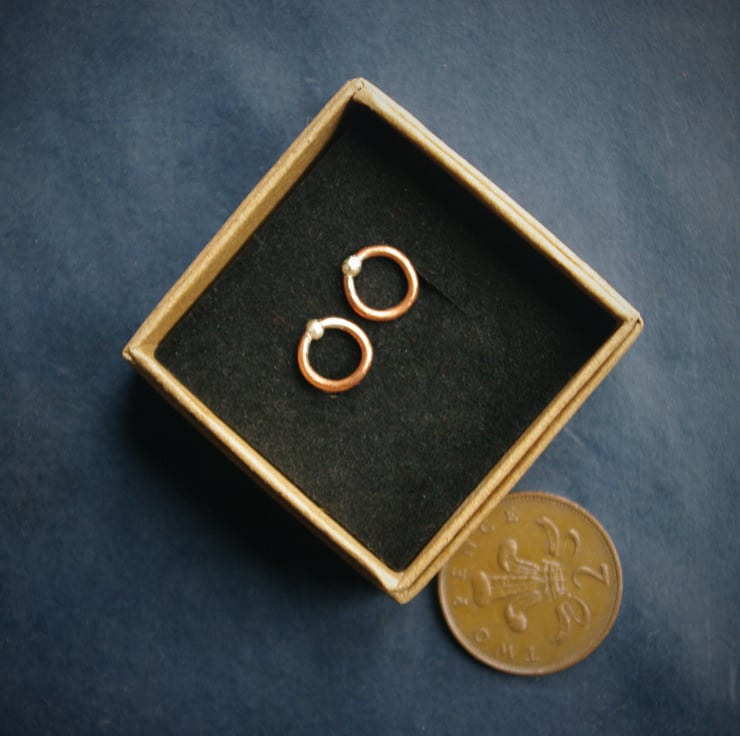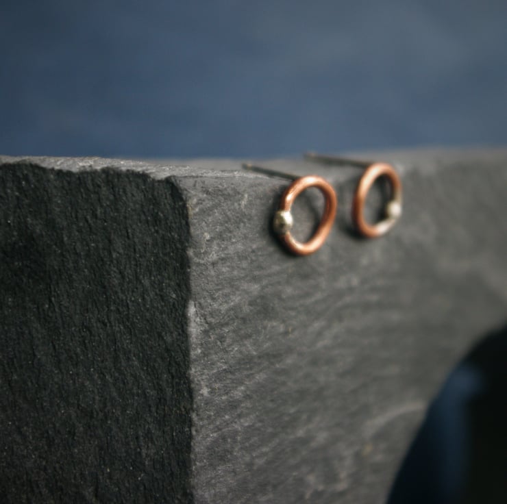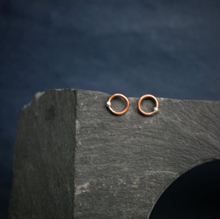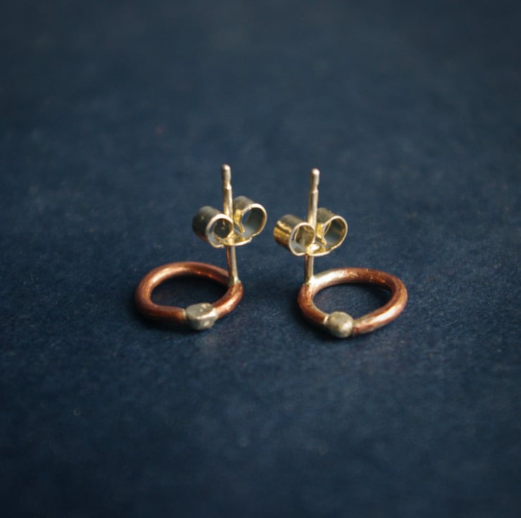 I have soldered flattened copper wire into a rough circle of 10mm in diameter and included a silver blob within it. The earposts and butterfly backs are sterling silver.