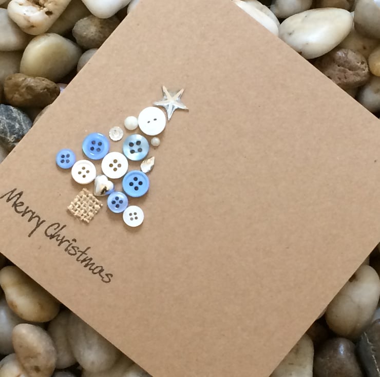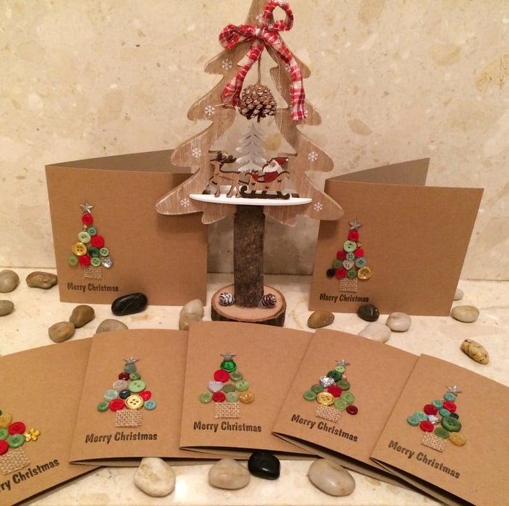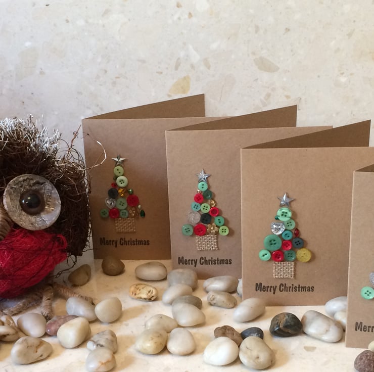 A pack of 4 rustic, delicate and handmade button Christmas Tree cards, using green, red, gold and silver/crystal buttons or an icy mix of blue, white and silver/ crystal. These gorgeous holiday cards are carefully handmade on 6" x 6" brown card, with 'Merry Christmas' hand stamped in black on the front. The tree is finished with a Jute pot. The card set is left blank inside for your own message. Perfect for that special relative or friend, this card is guaranteed to take pride of place on their mantel piece this year.