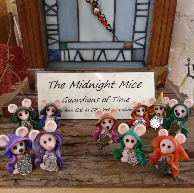The Midnight Mice have arrived in the Gnome Village ... Guardians of Time, each with their own Timepiece ... here is Tok with a unique toadstool timepiece ... this listing is for one Midnight Mouse.