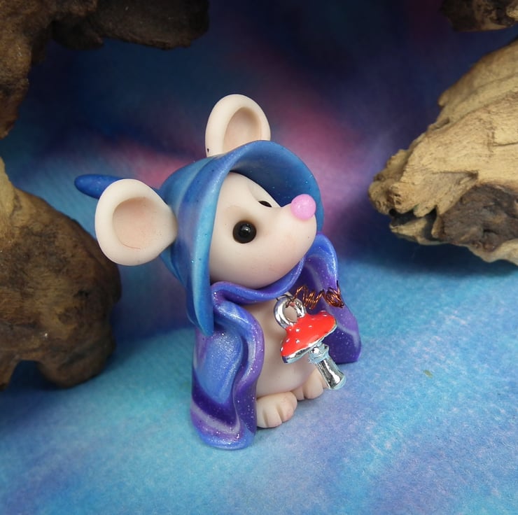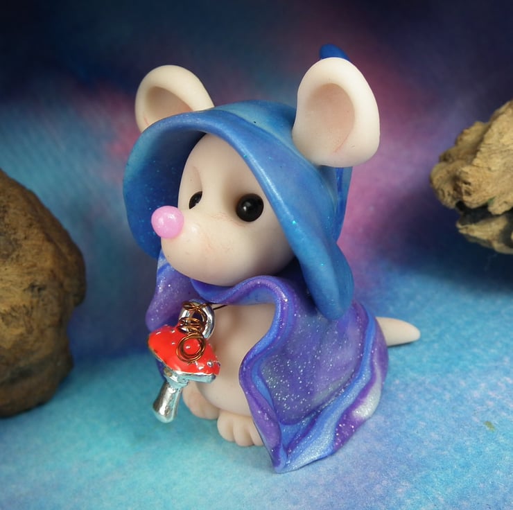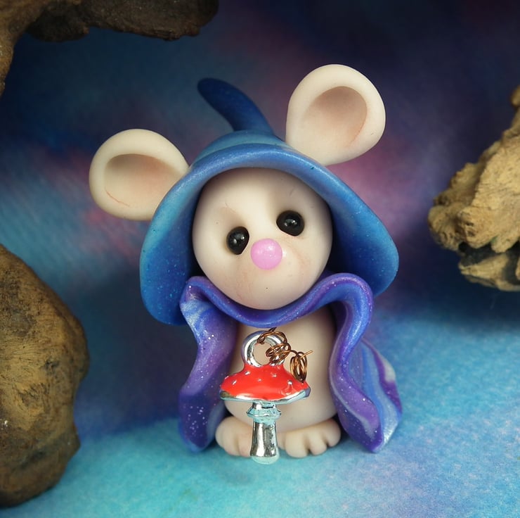 This is a 'one of a kind' creation having been entirely handmade without the use of moulds here at my studio on the Sussex Coast. Modelled with Prosculpt polymers, painted with heat set paints before sealing with lacquer, Tok has sparkling black onyx eyes and an enamelled toadstool. Tok the Midnight Mouse is just one and a half inches tall.