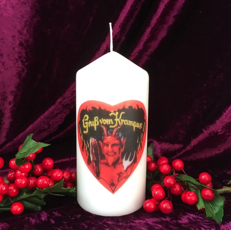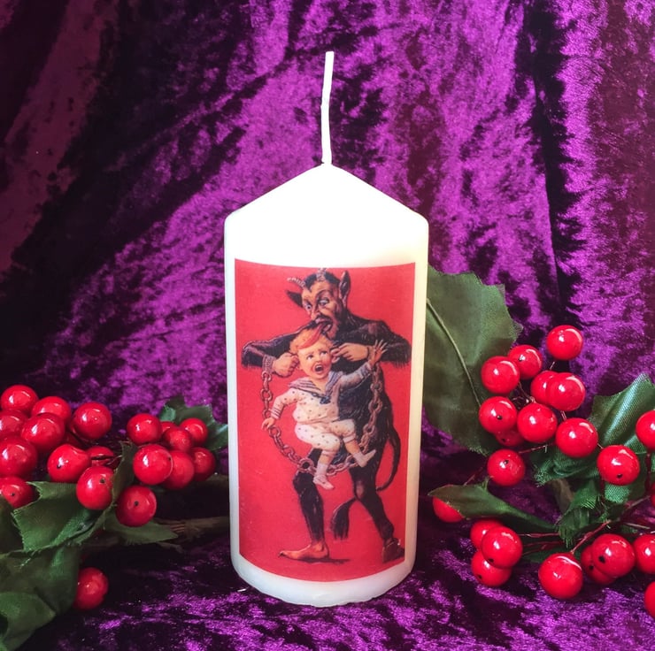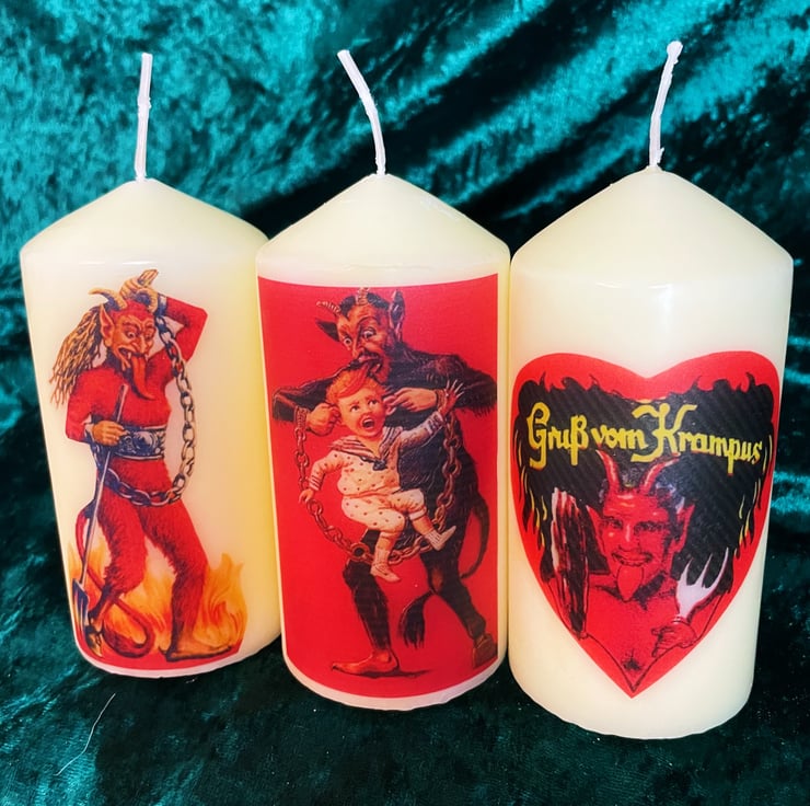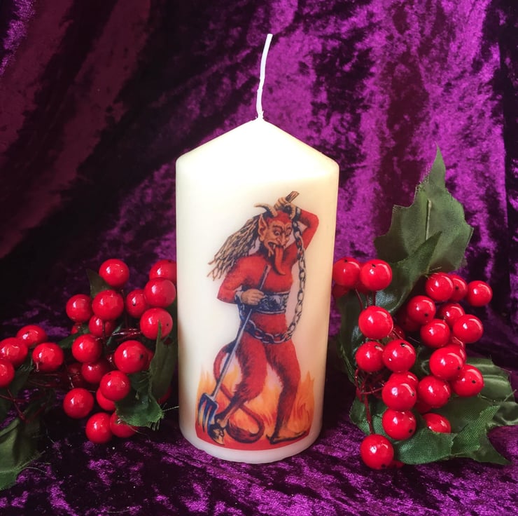 The Christmas Devil inspires these festive candles, which is a German folklore Krampus He was created as a counterpart to kindly St. Nicholas, who rewarded children with sweets. Krampus, in contrast, would swat "wicked" children and take them away to his lair if the children misbehaved