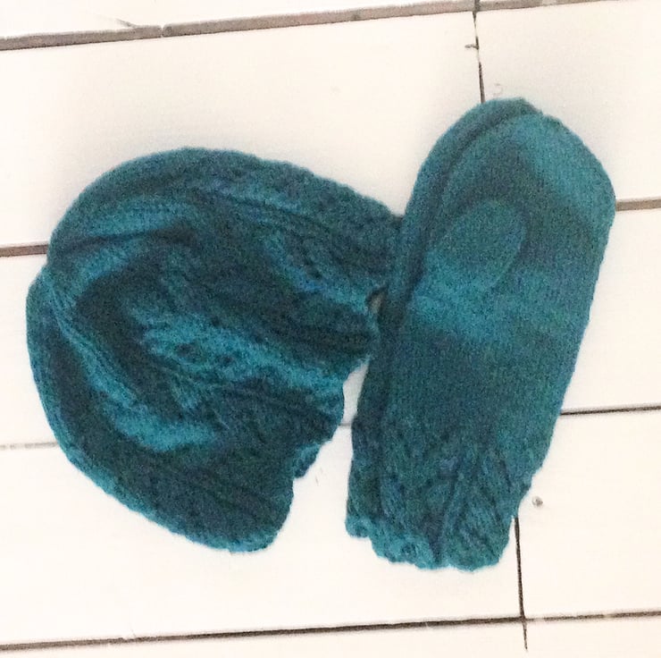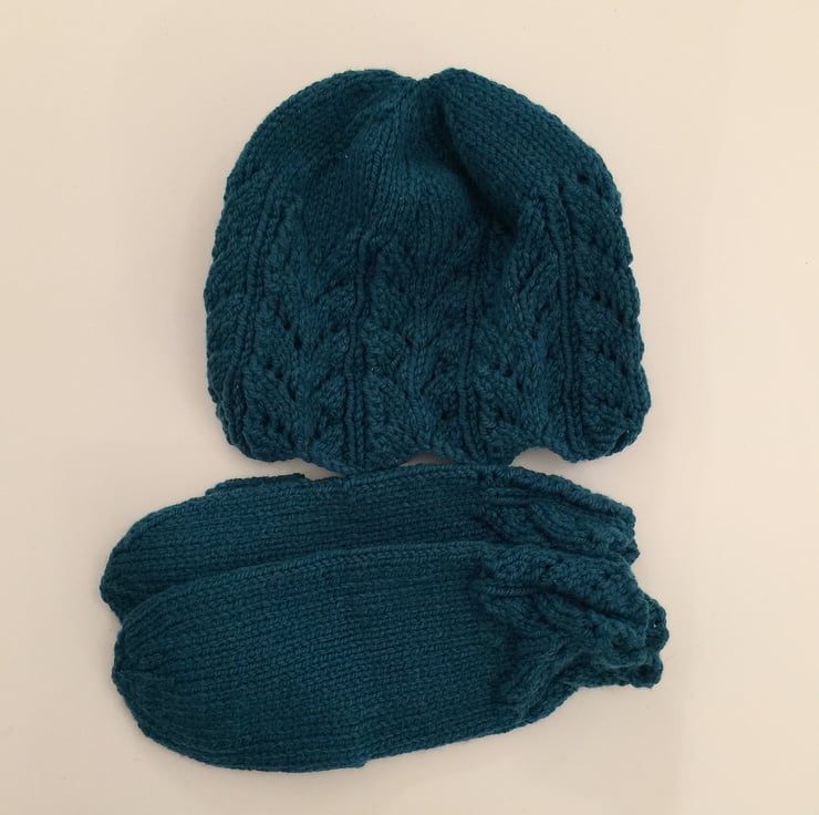 This beautiful set includes a decoratively knitted hat and pair of mittens in dark turquoise.